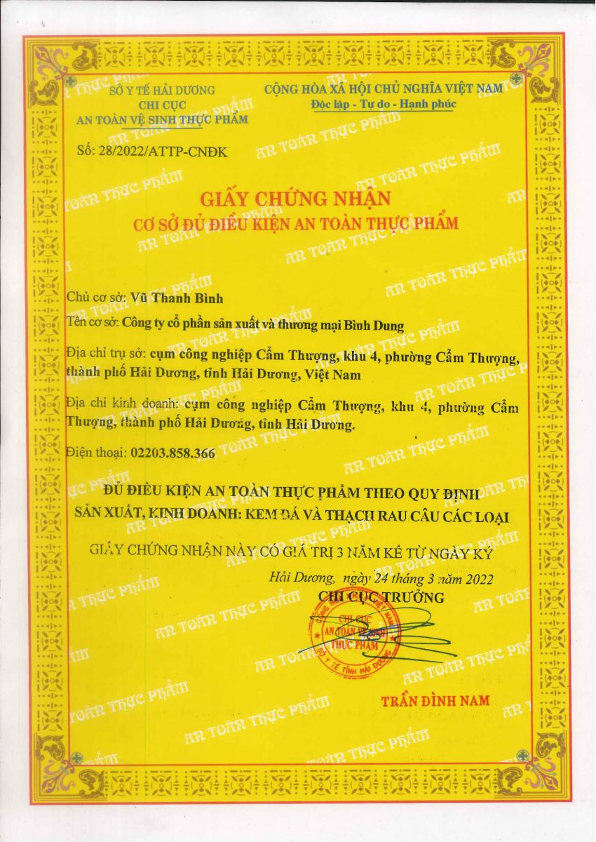 Với tôn chỉ đặt chất lượng lên hàng đầu, mọi sản phẩm của Công ty Cổ Phần SX & TM Bình Dung đều đạt chất lượng vệ sinh an toàn thực phẩm từ các khâu chọn lựa, bảo quản nguyên liệu đầu vào đến quá trình sản xuất và vận chuyển kem tới tay người tiêu dùng